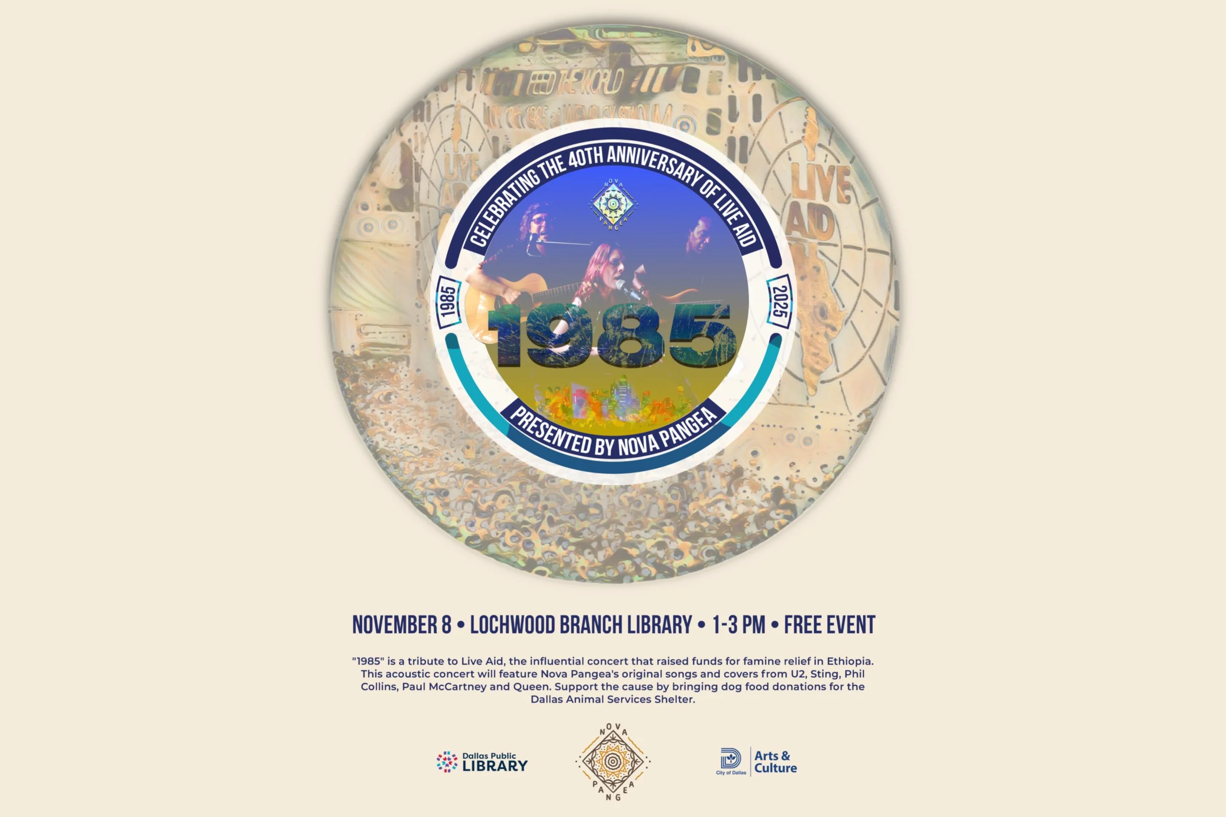Nova Pangea’s 1985 concert will be a concert where individuals who lived through the experience of Live Aid will have the opportunity to relive it and recapture the magic of that historical day in music. Nova Pangea will arranged and perform selected songs from bands that performed at those concerts, as well as songs by Sentido Contrario (Uriel's first rock band) along with Nova Pangea's original music. The event will kick off with an inspiring look at the profound impact of Live Aid and its enduring relevance today. This is why, if it passes insurance approval, we will empower people to bring food for humans and animals to be donated to Meals On Wheels, and the Dallas Animal Services Shelter. This way, younger audiences will also experience the inspiring power of music in supporting a philanthropic cause. 1985 concert will also include a slide show with pictures and videos capturing the most impressive moments of Live Aid. We feel that the world needs to remember why July 13, 1985 was also known as “the day the music changed the world”.